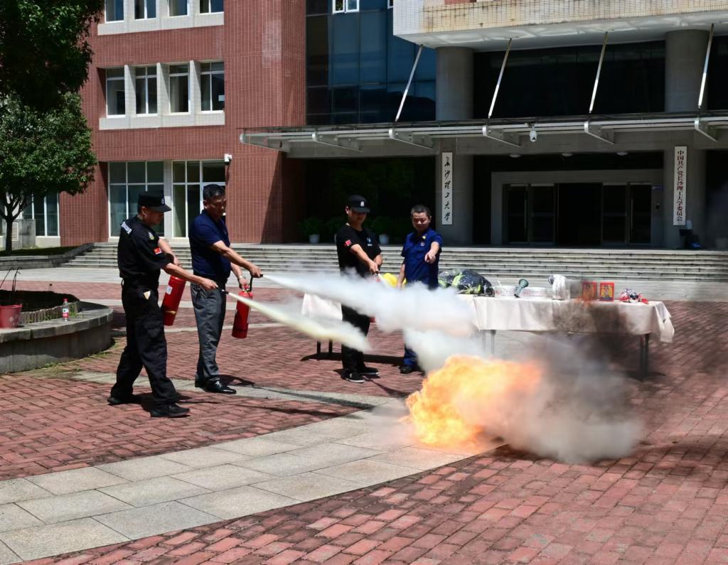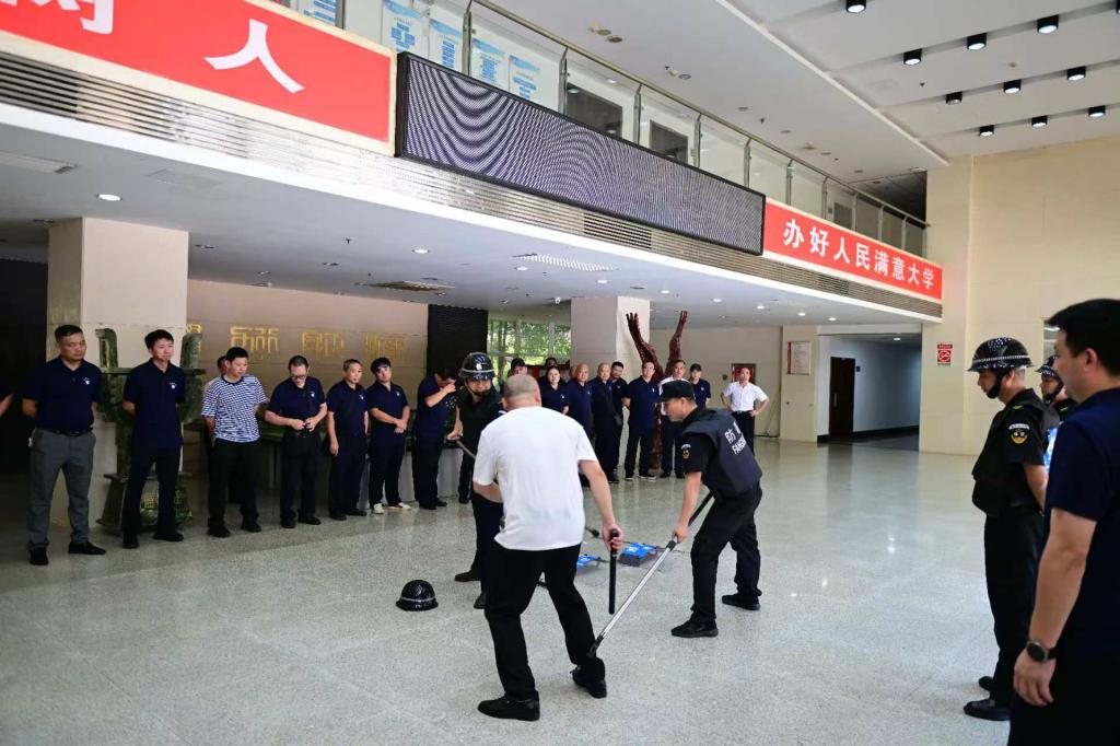本次培训采取理论学习和实战演练相结合的方式进行。在理论培训环节,宋凡为全体学员进行反恐防暴、防范电信诈骗等知识培训,湖南省新蓝盾保安服务公司培训部部长汤俊龙进行安保业务技能培训,长沙市天心区消防救援大队资深火调员伍交荣进行消防安全专题培训。在实战演练环节,全体保卫人员在教官的指导下,重点围绕反恐防暴、消防安全等方面开展演练,通过模拟真实场景,进行了钢叉、盾牌、消防器械等设备的使用训练,切实提升了保卫队伍应对突发事件的快速反应和应急处置能力。