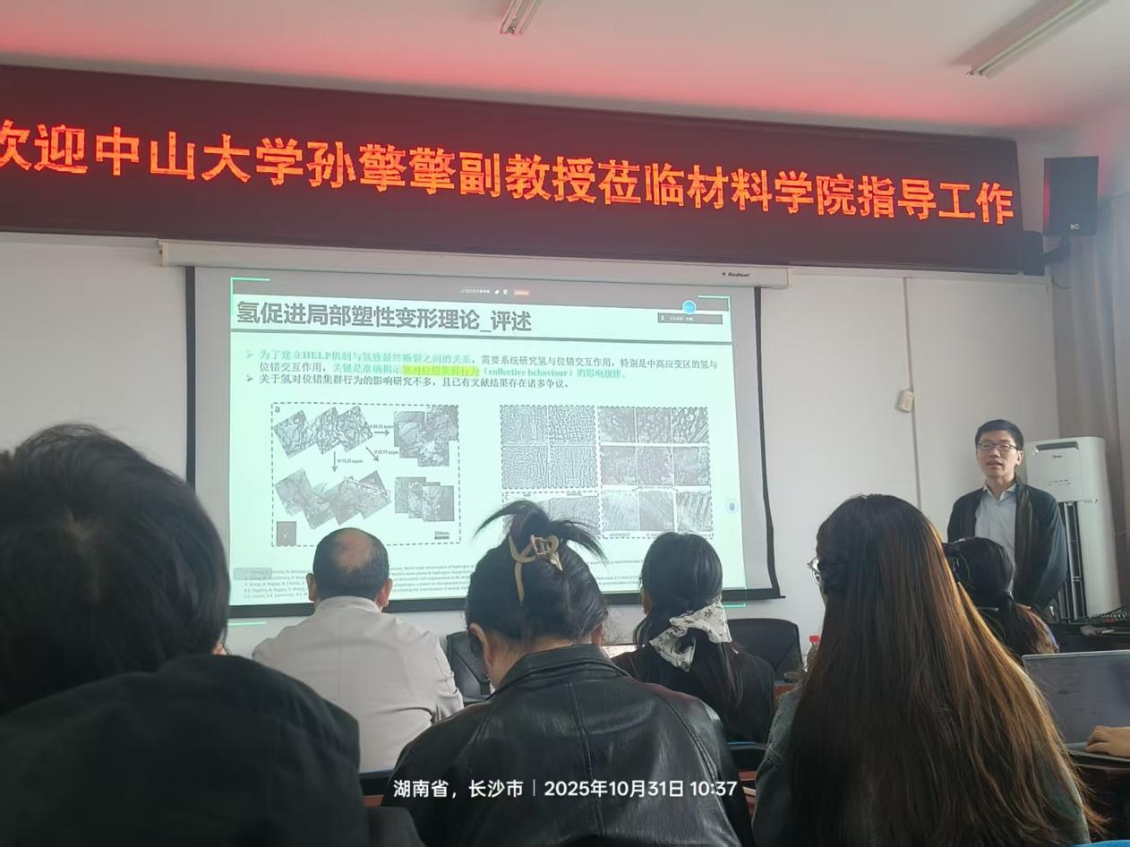 2025年10月31日上午10:00,云塘校区新能源1A-908教室座无虚席。中山大学孙擎擎副教授受邀做客材料学院开展通识讲座,以“氢与位错交互作用的晶体取向关联性研究”为主题,通过多尺度实验与跨维度分析,深度解析氢脆核心机理,为新能源装备抗氢脆设计提供关键学术支撑,相关研究成果发表于《Acta Materialia》等材料领域顶级期刊,具有重要国际影响力。