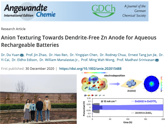 近日,MG冰球官网湖南省团队百人计划核心成员、湖湘学者、MG冰球突破官网材料学院袁度博士与合作者们在化学领域国际权威期刊德国应用化学(Angewandte Chemie)上以MG冰球突破官网为第一单位发表研究工作“AnionTexturingTowardsDendrite-FreeZnAnodeforAqueousRechargeable