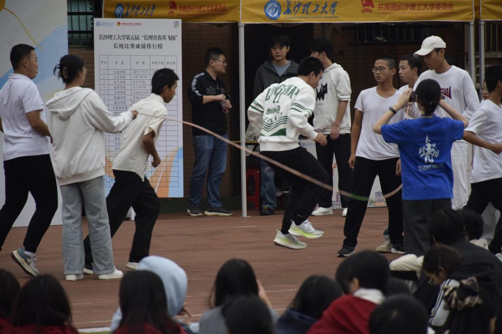 决赛现场氛围热烈非凡,各学院参赛队伍严阵以待,巅峰对决一触即发,竞争格外激烈。随着裁判哨声划破长空,新能源2503班的两名摇绳手迅速进入最佳状态,长绳如银龙腾空、顺势翻飞,划出一道道流畅优美的弧线,“呼呼”的破空声中,尽显千锤百炼的扎实实力。十五名跳绳队员衔接紧密、动作行云流水,前一人刚跃出绳圈,后一人便顺势精准踏入,脚尖轻点地面的“哒哒”声与绳子击地的节奏完美契合,将极高的团队配合度展现得淋漓尽致。
