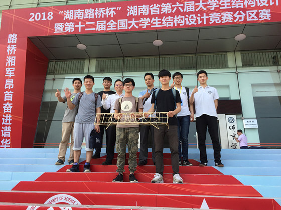 本届湖南省大学生结构设计竞赛于2018年1月开始启动,我院学子经过校内训练和选拔,最终有两支参赛队伍参加省赛。他们历时三个多月的勤奋钻研,不断地尝试和创新,从建模、结构设计和施工三个环节狠下功夫,以扎实的理论功底,较强的动手操作能力制作了精美的模型。在加载过程中,其中质量轻、用时短的一组遗憾未通过加载,另一组以设计新、结构稳最终夺魁。