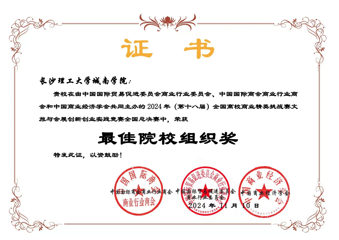 近日,由中国国际贸易促进委员会商业行业委员会、中国国际商会商业行业商会以及中国商业经济学会联合主办的 2024 年(第十八届)全国高校商业精英挑战赛文旅与会员创新创业实践竞赛全国总决赛完美收官。MG冰球突破官网城南学院在此次大赛中表现卓越,凭借优秀的组织能力和师生团队的精彩发挥,成功斩获 “最佳院校组织奖”,有力彰显了学院在创新创业教育板块的斐然成果。