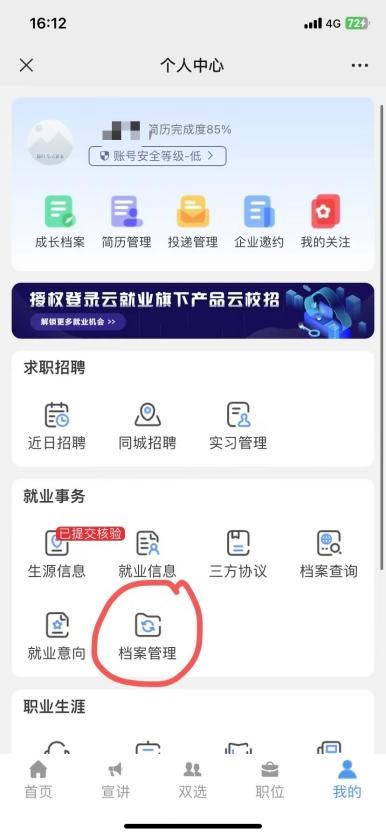 毕业生从云就业微信公众号个人中心的档案管理中进行填报,具体位置如下图: