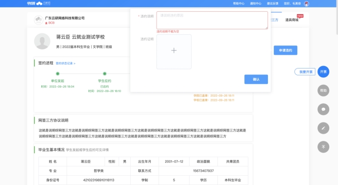 b)点击【申请违约】并填写信息点击【确定】,由学校审核,审核通过后则当前三方无效;