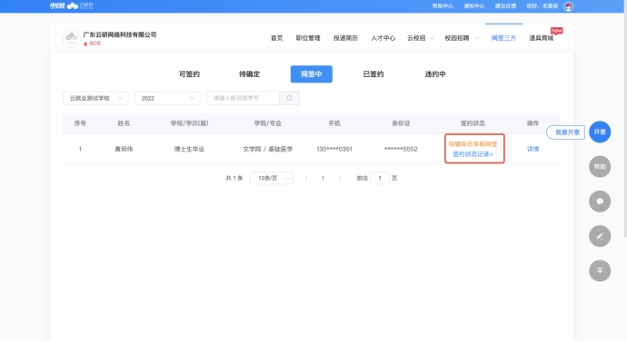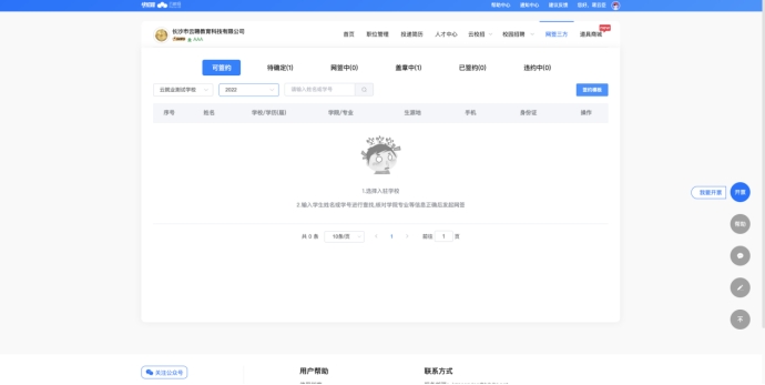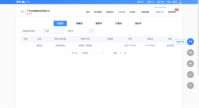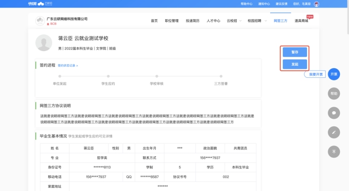 b)【搜索学校】-【输入学号或姓名】查找学生,点击【发起网签】并完善三方协议信息,学生即可接受到单位三方邀约信息;