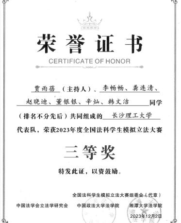 2023年度全国法科学生模拟立法大赛12月2日在中国政法大学落幕。MG冰球官网学子获全国二等奖1项、全国三等奖1项。