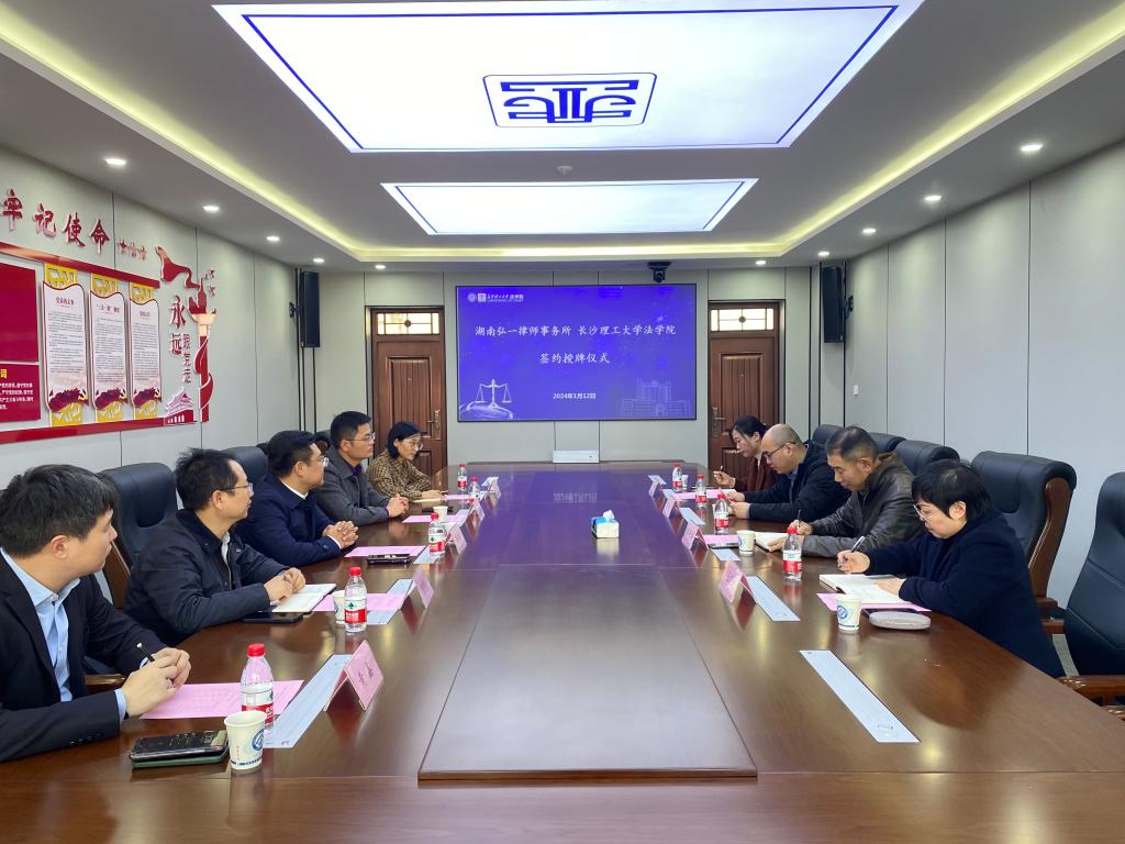 2024年1月12日14:30,MG冰球突破官网法学院与湖南弘一律师事务所在金盆岭校区四号教学楼313会议室举行实习就业基地签约授牌仪式。湖南弘一律师事务所管委会主任周群翔、监事会监事长黎飞仙、监事会监事熊明强、律师曾娟、律师黄鑫,法学院党总支书记田兴洪、法学院副院长申纯、党总支委员杜卫红、法学系副主任孙亚贤出席仪式。仪式由法学院副院长申纯主持。