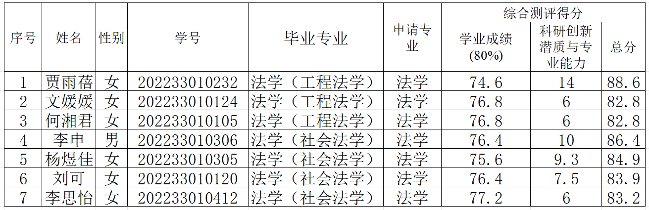 根据《MG冰球突破官网推荐优秀应届本科毕业生免试攻读硕士学位研究生实施办法》(长理工大教〔2024〕26号)和《法学院2026年推免生遴选工作实施方案》等文件精神,经学院学工办对学生思想品德进行考察合格后,学院推免生遴选与审核鉴定工作小组依据学业成绩、学术成果、获奖情况(含在体育和社会工作中有突出表现)等方面,对申请同学的材料进行综合测评,2026年拟推荐免试攻读硕士学位研究生名单及综合测评得分情况如下: