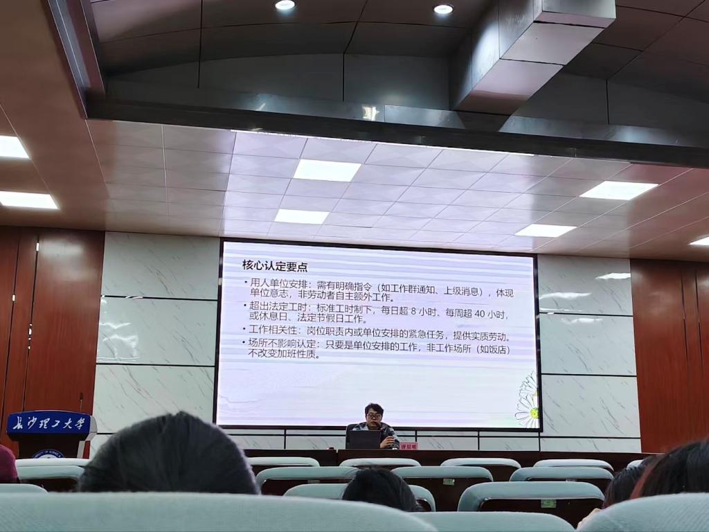 讲座伊始,唐老师从“好友聚餐当场拿出电脑修改程序”的生活趣事切入,生动勾勒出当下职场人“24小时待命”的现实图景,并由此抛出核心疑问:下班后处理的零碎工作是否属于加班?他结合《劳动法》提炼出加班认定的核心要点,同时直指现实困境,吸引了同学们的注意力。