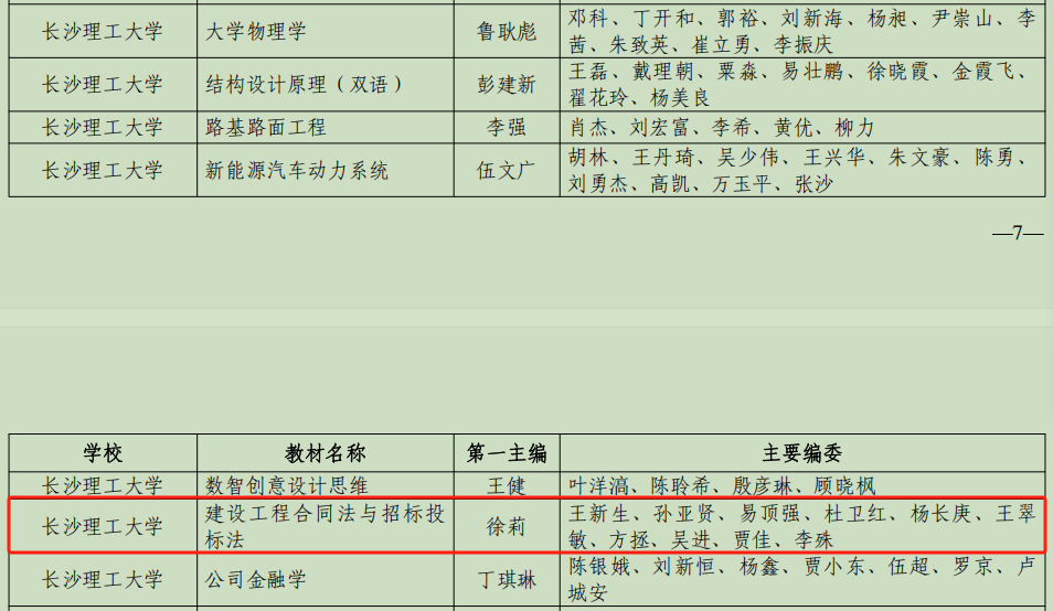 近日,湖南省教育厅正式发文公布2025年普通高等学校数字化教材拟立项建设名单,我院徐莉教授牵头工程法教学团队编写的《建设工程合同法与招标投标法》教材成功入选。作为本次MG冰球官网省级数字化教材建设立项的7本教材之一,实现了我院在省级教材建设领域的历史性突破,可喜可贺!