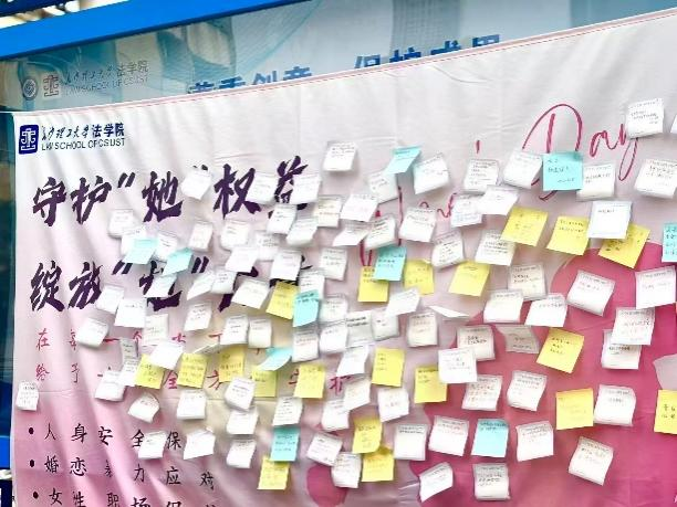 “以‘法’之名,护‘她’权益——法学院主题特色活动”主要在法学院守正学社一站式学生社区内开展。活动现场,工作人员陈列了一系列内容详实、形式多样的妇女权益保护宣传手册。同时,一束束娇艳欲滴的玫瑰花也作为美好祝愿被赠予她们,让整个空间弥漫着温馨与喜悦。受此温馨氛围的感染,到场的女生们纷纷拿起笔,在一张张精致的便签纸上倾注心声,这些心愿汇聚成一股温暖的力量,不仅映照出她们内心的光芒,更为这场活动增添了几分深刻的意义。