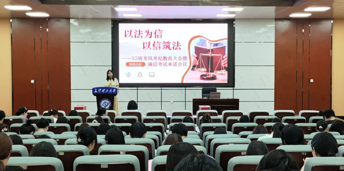 为了让每一位同学都能深刻认识到考风考纪的严肃性,自觉遵守考试纪律,以真实水平参加期末考试,法学院22级辅导员孙佳乐于2025年5月21日10点在四教报告厅召开了“以法为信,以信筑法”考风考纪教育大会,着重强调考试纪律与参考诚信要求,倡导全体同学交上属于22级法律人的一份“诚信答卷”。