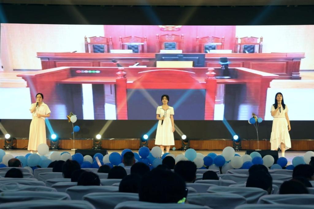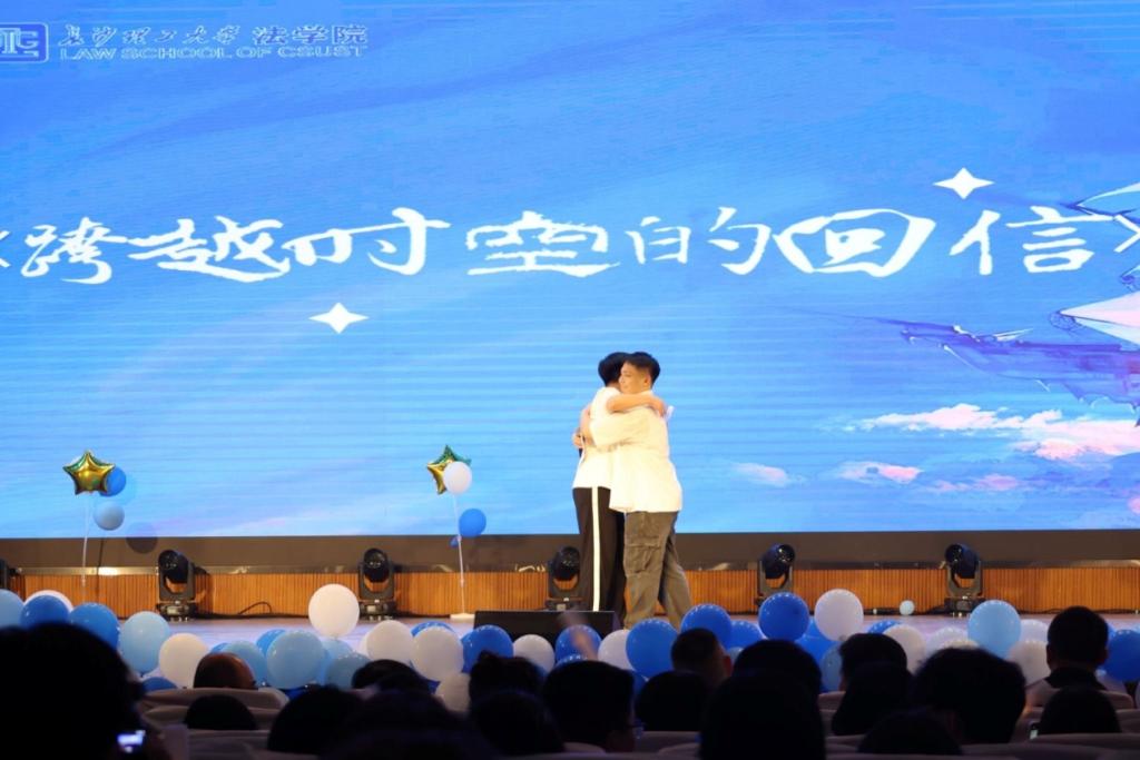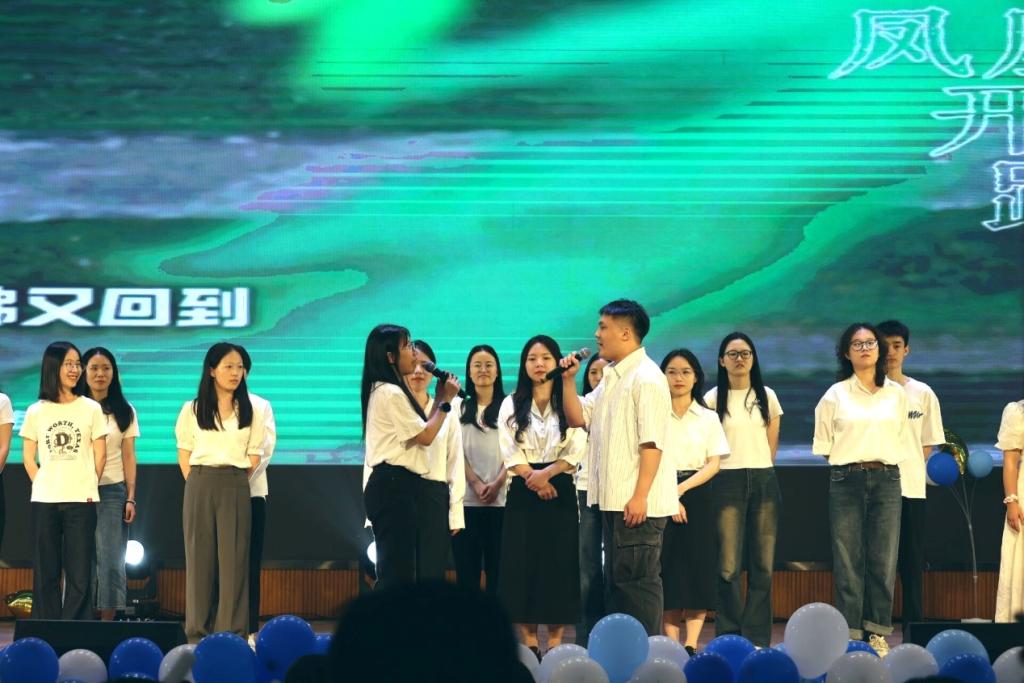 伴随着激昂的音乐,节目表演环节正式拉开帷幕。开场舞瞬间点燃了现场的气氛,青春活力的舞姿展现了毕业生们的朝气蓬勃。随后,师生们共同朗诵的《告别,穿过青春岁月,你走向我》,用深情的文字表达了毕业之际的难舍之心和对毕业生们的真挚祝福。接下来,更为丰富多彩的节目依次登台,《跨越时空的回信》一一展现了同学四年前给自己写的信件,并用回信的方式,温情呼应。配音节目巧妙结合法学特色,更是将晚会推向高潮,让观众们在欣赏表演的同时,感受到法学的独特魅力。最后,2022级法律硕士班级的合唱《凤凰花开的路口》为晚会画上圆满句号。同学们尽情展现自己的才华和热情,为在场的每一位观众带来了一场视听盛宴,赢得了观众的阵阵掌声。