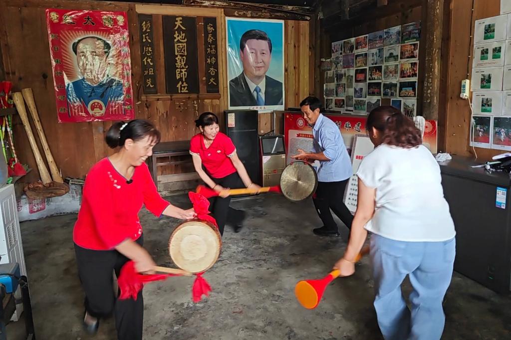 实践团队首站抵达桑植民歌寨非遗传承基地,在工作人员引导下参观特色稻田与民歌文化展区。通过聆听讲解,团队深入了解了桑植民歌的历史渊源、艺术特色及传承价值,为后续研究奠定认知基础。23日,团队赴瑞塔铺镇拜访桑植围鼓市级传承人彭辉峪、桑植花灯省级传承人满元恒及市级传承人李晓香。在彭辉峪家中,团队观察到其堂屋陈列的乐器与荣誉证书,直观感受到非遗传承的厚重积淀;满元恒与李晓香则通过几十年坚守桑植花灯的动人故事,诠释了非遗传承人的文化使命。团队还参与围鼓演奏体验,深化了对非遗技艺感染力的理解。24日,团队奔赴马合口白族乡麦地坪村,拜访了桑植白族仗鼓舞国家级非遗传承人钟必武及其徒弟——市级传承人钟彩香、钟新化,县级传承人刘银年,以及桑植白族游神市级非遗传承人钟高仁。钟必武先生的传承事迹践行了“义务传承、喜爱传承、奉献传承”精神,老先生希望特色文化能得到更广泛传播, 呼吁更多年轻人参与传承