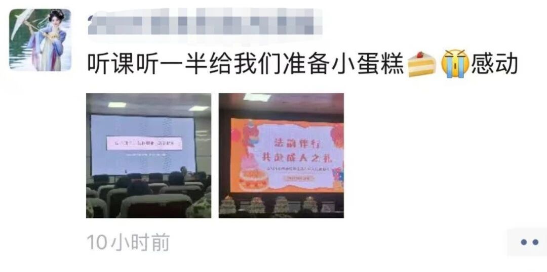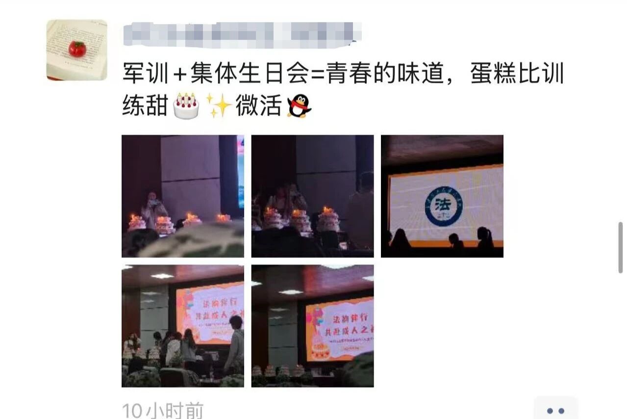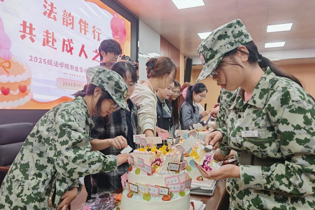 灯光亮起,辅导员曾宇欣把十几天的军训剪影浓缩成激励的话语,跑道上的汗水、方阵里的口号,都将成为他们法律生涯的“序章”。她提醒2025级新生,“大学”二字从即将真正落笔,课堂里要啃得下厚重典籍,实践中要守得住滚烫初心,并表示:“这个集体成人礼生日会,不仅是为了给大家送上生日的祝福,更希望能让你们在热闹的氛围中感受到集体的温暖,更快融入班级、融入校园。未来几年,你们会在这里学习知识、结识挚友、追逐梦想,会遇到成长的挑战,无论何时,遇到困难都可以找老师倾诉——我们会一直陪伴在你们身边,见证每一个人的成长与蜕变。”说完,她带领所有“九月寿星”一起切下第一刀,奶油香气散开,生日歌响起,正式为这段青春按下“开始键”。