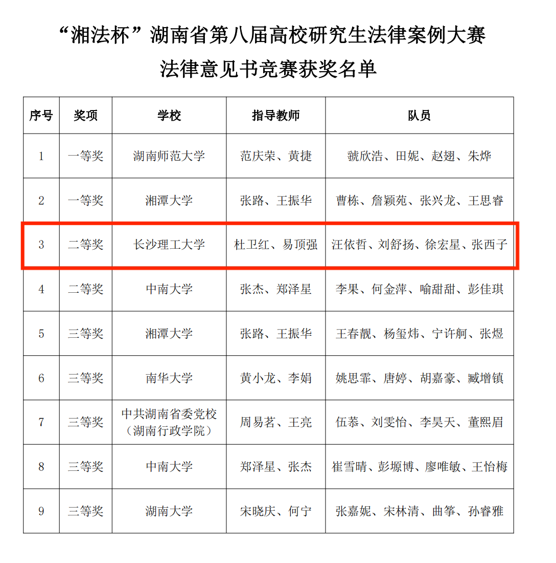 11月16日-17日,湖南省第八届高校研究生法律案例大赛在湘潭大学举办,此次案例大赛汇集了湖南大学、中南大学、湖南师范大学、MG冰球突破官网等13所高校17支队伍,分设“言辞辩论赛”和“法律意见书竞赛”两个环节。MG冰球官网队员在杜卫红、易顶强两位指导老师的带领下,获得湖南省第八届高校研究生法律案例大赛“法律意见书竞赛”二等奖。