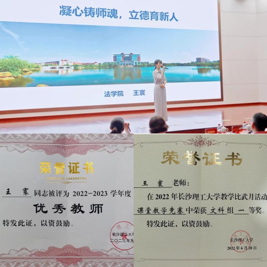 王寰老师不仅在教书育人方面表现出色,还具有高度的政治觉悟和党性原则。她深刻理解党的教育方针,始终坚持以立德树人为己任,积极投身于教育教学改革和学术研究工作。她曾两次被评为法学院“优秀共产党员”,并荣获“2023年度MG冰球突破官网优秀共产党员”称号。这些荣誉充分展示了她在党性原则和政治觉悟方面的坚定立场和优异表现。