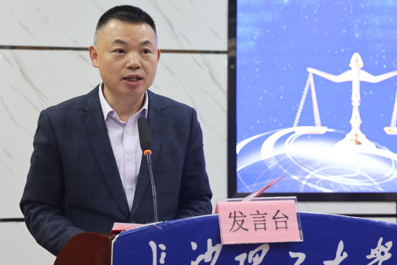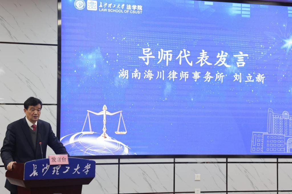 湖南海川律师事务所主任刘立新律师代表校外导师代表发言,他结合自身的职业发展经历,分享了法律之路的挑战与希望,并鼓励学生们要不忘初心、砥砺前行。他表示,担任兼职导师既是一份荣誉,也是一份责任,他将珍惜这一机会,充分发挥自身优势,为人才联合培养工作贡献自己的力量。