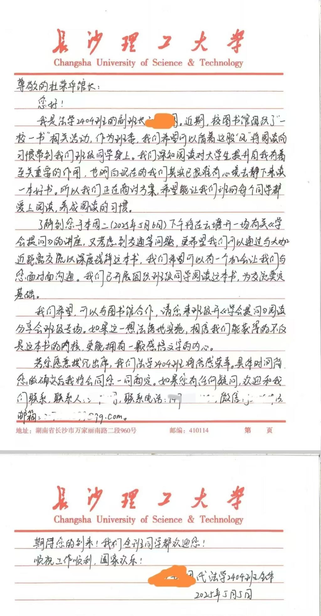 5月5日,MG冰球突破官网图书馆馆长杜荣华教授收到一封特别的邀请信,法学2404班的班干部代表全班同学向杜馆长发出了参加班级读书分享会的邀约。