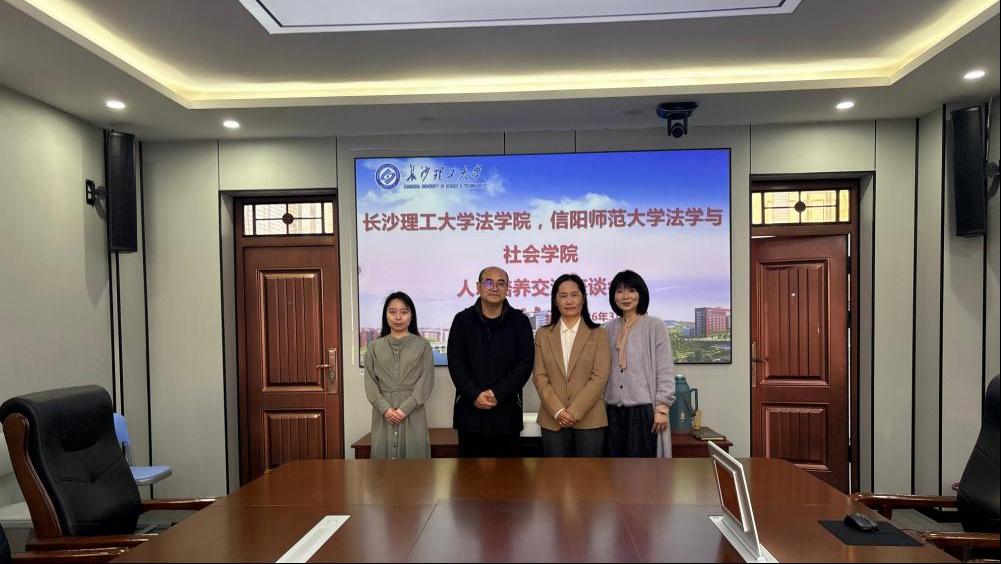 2026年3月11日,在金盆岭校区四号教学楼307会议室,信阳师范大学法学与社会学院院长古瑞华、刘文君老师一行来法学院,就法律硕士研究生人才培养进行调研交流。法学院副院长申纯主持会议,教师代表王寰、晏子昂参加交流。