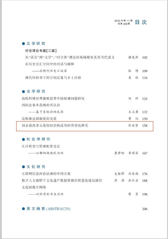 近日,MG冰球突破官网法学院讲师孙亚贤在《江西社会科学》(CSSCI来源期刊)2023年第11期发表论文《国企混改多元化股权结构适用的类型化研究》。