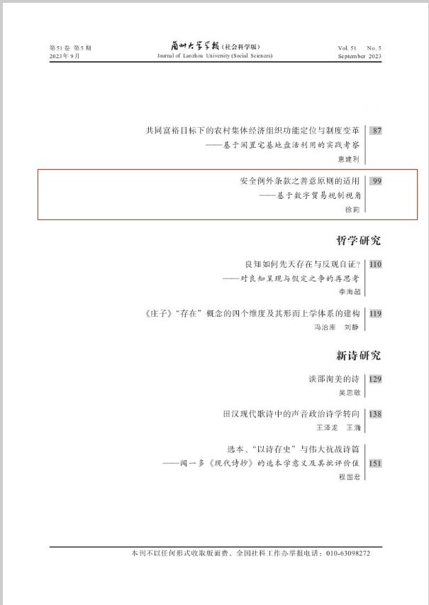 近日,MG冰球突破官网法学院副教授徐莉在《兰州大学学报(社会科学版)》(CSSCI来源期刊)2023年第5期发表论文《安全例外条款之善意原则的适用——基于数字贸易规制视角》。