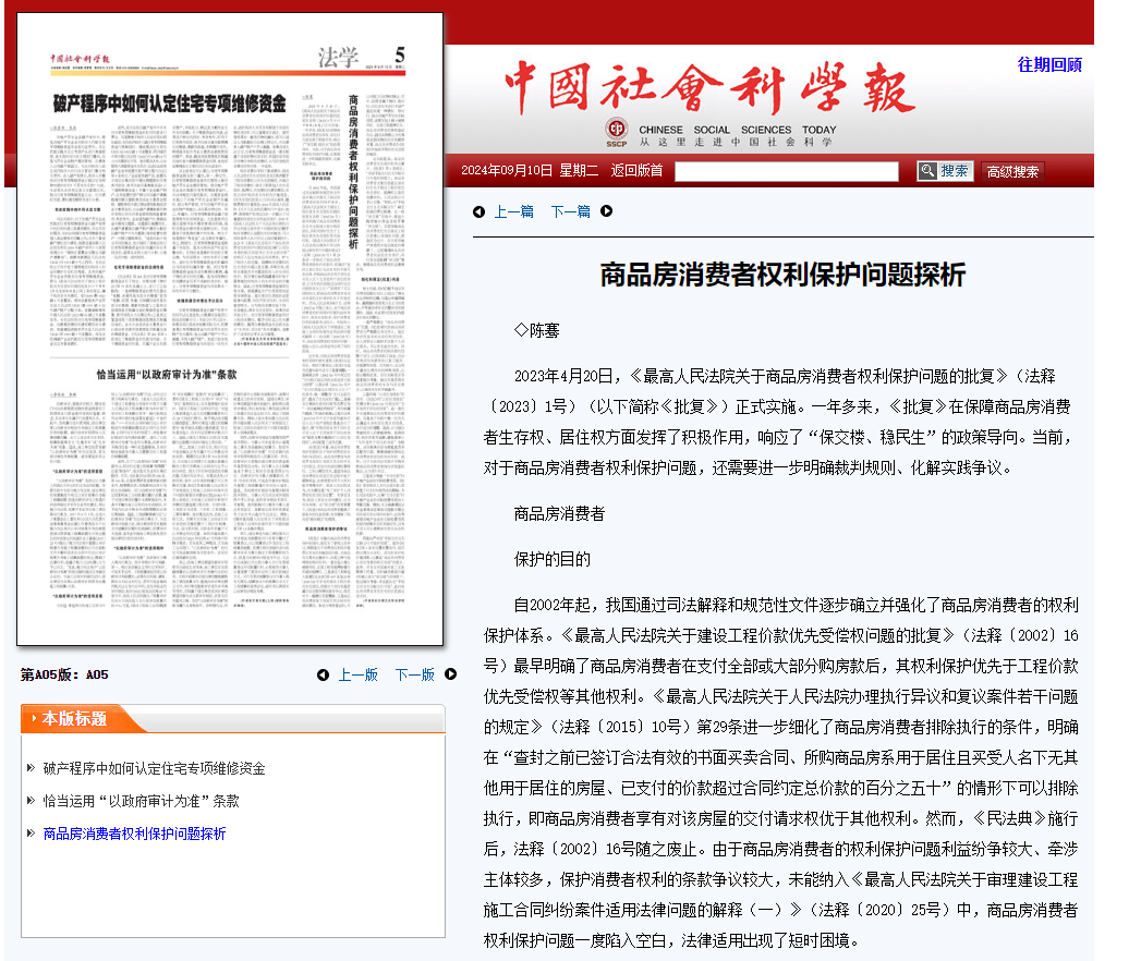 近日,MG冰球突破官网法学院讲师陈骞的理论文章《商品房消费者权利保护问题探析》在《中国社会科学报》发表。