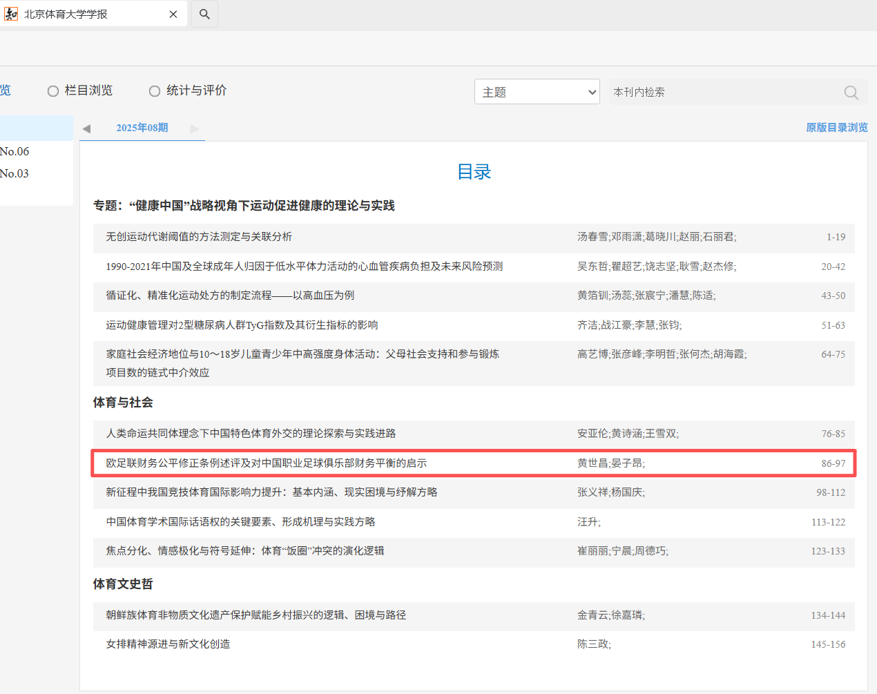 近日,MG冰球突破官网法学院讲师晏子昂在《北京体育大学学报》2025年第8期发表论文《欧足联财务公平修正条例述评及对中国职业足球俱乐部财务平衡的启示》。
