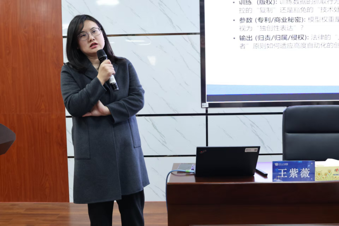 万兴科技集团高级法务王紫薇经理以“AIGC时代的知识产权新挑战与法律重构”为题进行发言。她分享了AI企业数据训练在获取授权时面临的诸多挑战,呼吁法律应当承认AI训练数据的“合理使用”例外,建立“合规免责”机制,从而为产业创新预留空间。