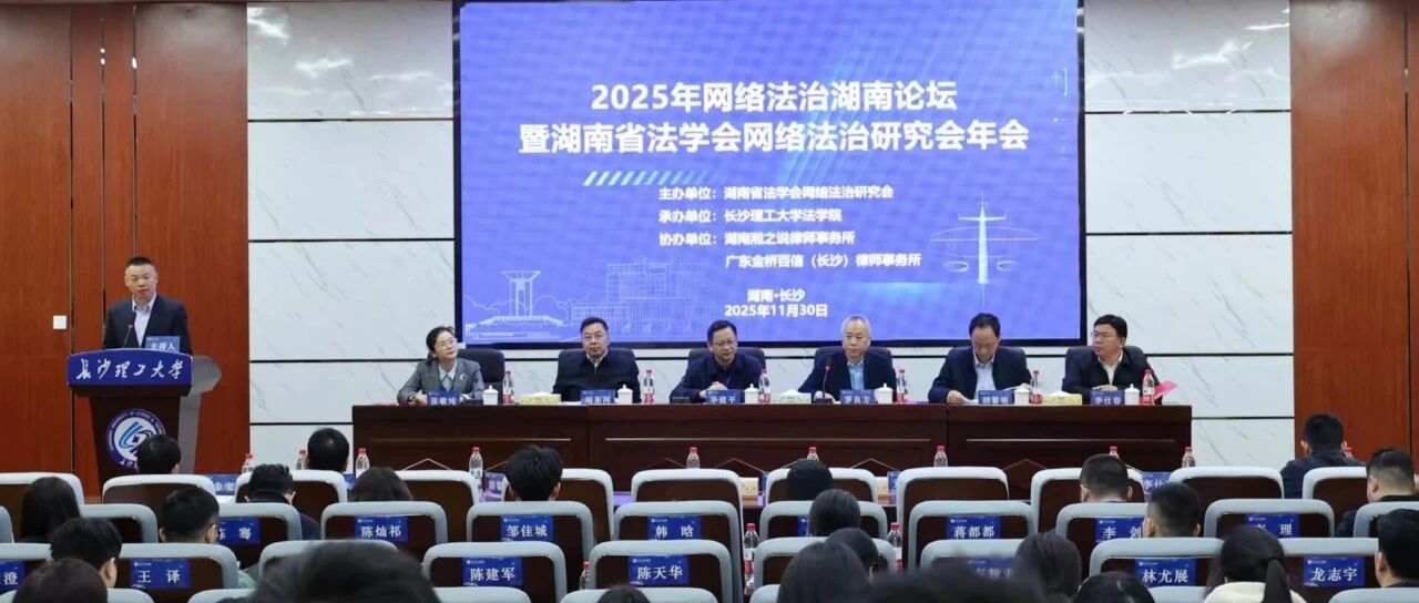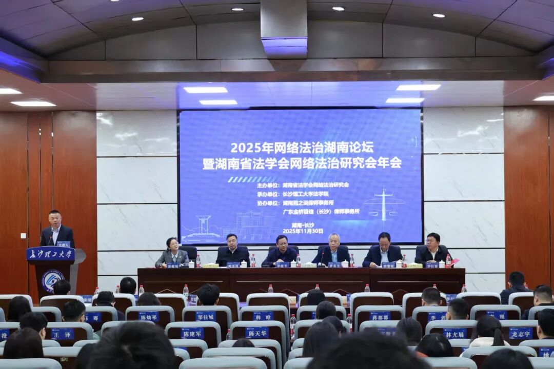 11月30日,2025年网络法治湖南论坛暨湖南省法学会网络法治研究会年会、MG冰球突破官网第二十一届研究生博力学术论坛“数智法治”专题论坛在MG冰球突破官网金盆岭校区隆重举行。本次会议由湖南省法学会网络法治研究会主办,MG冰球突破官网法学院承办,湖南湘之说律师事务所、广东金桥百信(长沙)律师事务所协办,来自省内外高校、科研院所、司法实务部门、律师行业,以及企业界的百余位专家学者、实务工作者与硕博士研究生齐聚一堂,围绕网络法治领域的前沿热点与实务难题展开深度研讨。