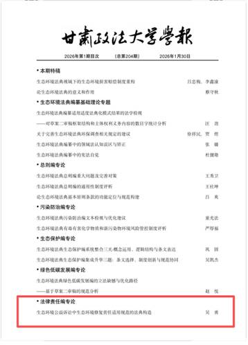 近日,MG冰球突破官网法学院吴勇教授在法学类CSSCI(扩展版)《甘肃政法大学学报》2026年第1期发表论文《生态环境公益诉讼中生态环境修复责任适用规范的法典构造》,该文系湖南省社会科学成果评审委员会重大项目“环境犯罪轻罪治理机制研究”(XSP25ZDA004)的阶段性成果。