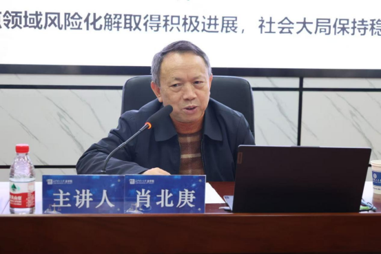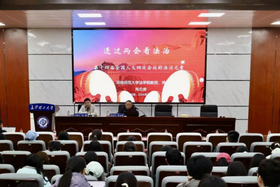 随后,肖北庚教授结合自身履职经历,围绕“全国两会中的法治元素与司法实践”作了深入浅出、高屋建瓴的专题讲授。肖教授首先从全国人大工作的法定程序切入,系统解读了全国人大会议的议事程序;进而结合本次全国人大会议审议的重点内容,联系当前法治前沿动态和“法不能向不法让步”的司法理念,深入解读了我国的法治实践图景,充分展现了法学学者通过人大履职服务法治建设的担当。肖教授还重点围绕政府工作报告和“两高”工作报告内容中的相关问题进行了深入分析,勉励学子深入社会肌理、关注国计民生。