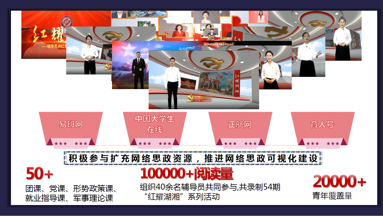 网络思政并非一座孤岛,而是能激发三全育人动能、贯通十大育人体系的链条。为了展现担当感,他和他的团队连续两年策划别样毕业季活动,相关直播被央视新闻、学习强国等转载,播放量20万+。他们将其与实践育人、课程育人等连通,让学生携网下乡,在田间地头、网上网下讲述法治故事,2023年暑期开展直播促农等活动9次。为了展现担当感,他连续两年与学校其他40余名辅导员开展红耀湖湘系列活动54期,累积播放量10万+,覆盖校内外青年群体2万+,此项工作获评全国优秀易班共建案例、湖南省高校思政工作精品项目。就这样,师生在网上网下有来有往,网络思政工作格局逐渐人来人往。