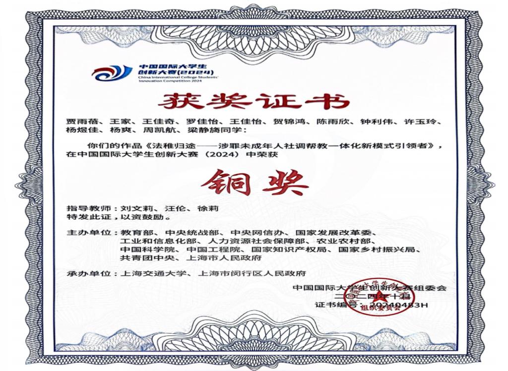 《专业社会调查》课程从2013年开设至今,历经十几载磨砺,今2025年已建设成为国家级社会实践一流课程,成为我院第一个国家级一流课程。依托本实践课程,刘文莉老师指导学生成功申报《罪错未成年人分级处遇制度实证研究》国家级大学生创新创业训练计划项目1项、成功申报校级大学生创新创业训练计划项目6项;以该课程为实践基础的“践行帮教志愿服务,培养高素质法治人才”案例,成功入选2021年湖南省高校“十大”育人示范案例。2024-2025年“法稚归途”团队先后获得大学生挑战杯竞赛省级三等奖,中国国际大学生创新大赛国家级铜奖。