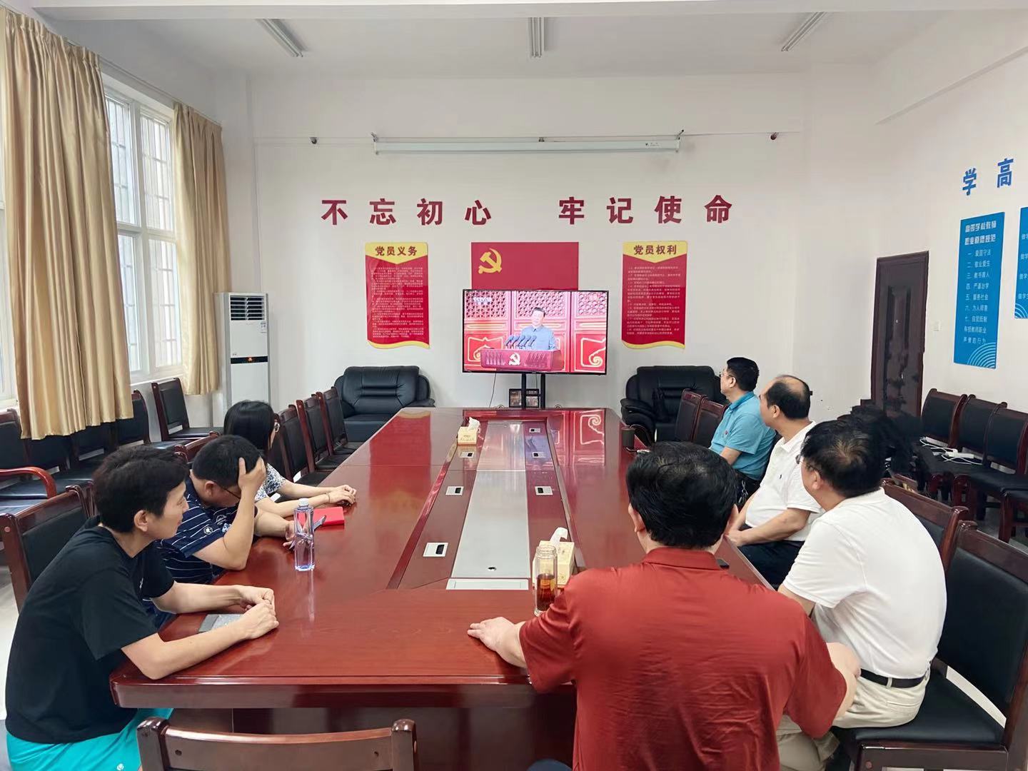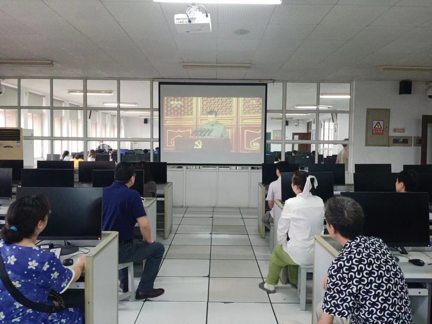 7月1日上午8时,庆祝中国共产党成立100周年大会在北京天安门广场隆重举行。中共中央总书记、国家主席、中央军委主席习近平发表重要讲话。根据直属支部的组织结构实际情况,我支部采取集中、分散等形式组织全院教职工收看大会直播,40余名教职工共同见证了这一伟大时刻。