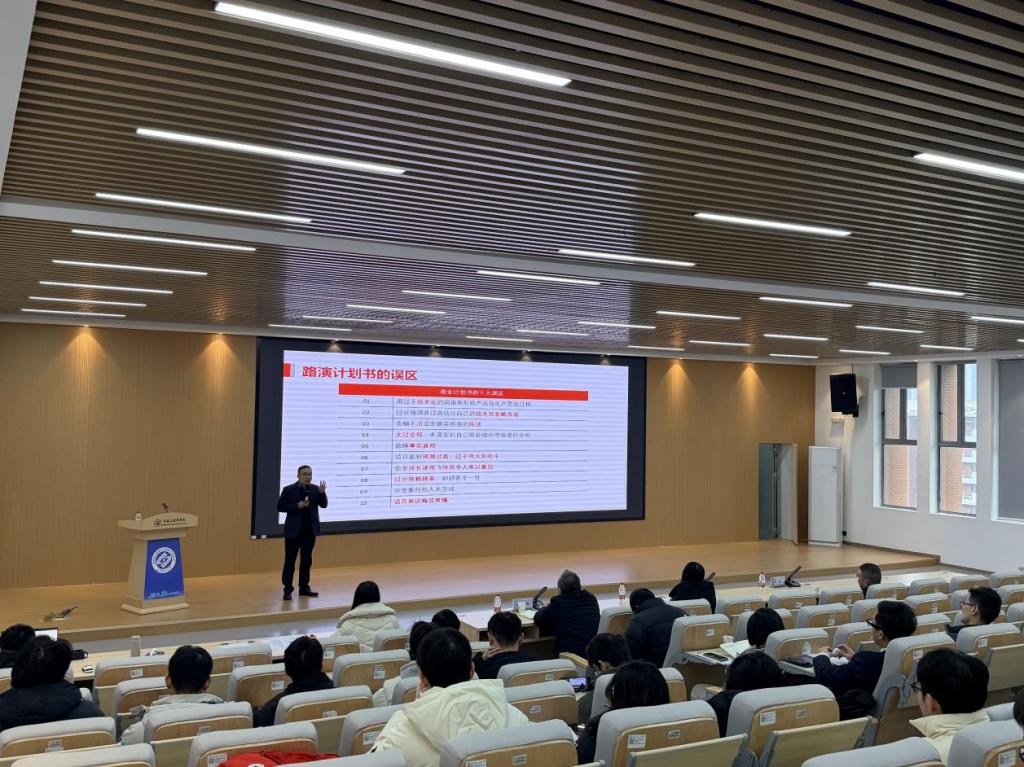 除普惠性的主题讲座外,路演实战演练与一对一项目“把脉”成为本次系列训练营的两大亮点,更具针对性与实效性。为促进理论知识向实战能力转化,训练营专门模拟“金种子杯”创业大赛真实评审场景,于12月16日与1月21日举办两场路演实战演练。各项目团队依次登台,在限定时间内清晰展示项目背景、核心优势、商业模式及发展规划。评委专家全程认真聆听,并从路演节奏、表达逻辑、PPT呈现、应答技巧等方面给予精准点评,现场示范优化方法,帮助团队提炼核心卖点、调整展示策略。