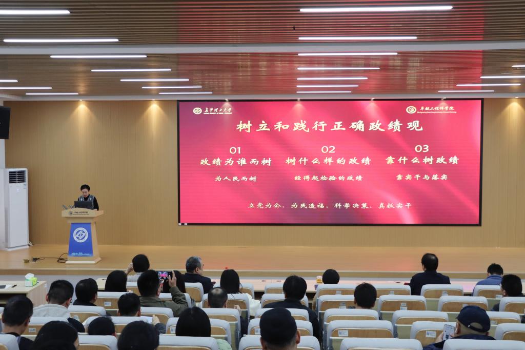 院党委书记杨晨领学树立和践行正确政绩观相关内容,围绕“政绩为谁而树、树什么样的政绩、靠什么树政绩”重大问题,结合学院实际分享体会。她指出,学院政绩要紧扣学生成长、产业需求,树立经得起历史和师生检验的实绩,以实事求是、干部带头的实干作风担当作为。她强调,各党支部要结合主题教育深化学习研讨,加强师德师风建设;全体教职工要以正确政绩观为指引,扎实推进教学、科研与育人工作,以高质量发展为学校建校70周年和“十五五”开局献礼。
