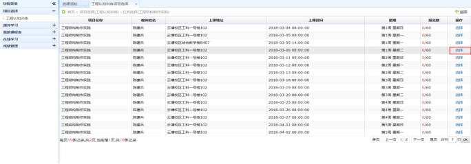 操作如下图:先在左侧菜单栏点击“项目选择”,再点击课程“工程认知训练”,右侧弹出“工程认知训练项目选择”页面,再在右侧项目列表中的“操作”栏下逐个选择选修项目,每个项目均需选择任课老师和上课时间、地点,注意避免上课时间冲突。点击左侧“我的课程表”,选满20个课时的选修项目,即可退出选课系统结束选课。