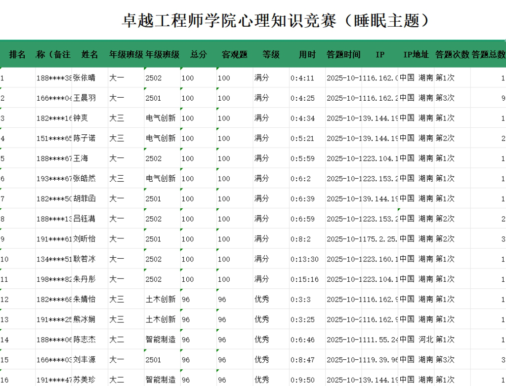 本次竞赛突破了传统线下活动的时空限制,充分利用数字化平台的优势,方便同学们在课余时间灵活参与。活动吸引了各年级同学踊跃参加。他们通过竞赛平台提供的学习资料与测试题目,系统性地回顾和学习了睡眠周期、睡眠障碍的成因与影响、睡眠与情绪情绪的密切关联以及改善睡眠质量的科学方法等核心知识。经过认真的学习和测试,所有参与同学均取得了优异的成绩,实现了100%的及格率。其中张依晴、王晨羽、钟爽等12位同学取得满分,14位同学取得优秀成绩,7位同学取得良好成绩,所有同学均在60分以上。这一结果不仅展现了同学们积极参与心理健康教育的热情,更反映出大家对睡眠知识的扎实掌握程度。
