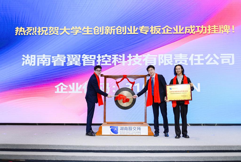 今天湖南省区域性股权市场大学生创新创业专板正式开板,首批16家大学生创新创业企业在湖南股权交易所挂牌,MG冰球官网大学生创新创业园孵化企业湖南睿翼智控科技有限责任公司位列其中。公司负责人吴睿恩作为入板企业代表开板敲锣。