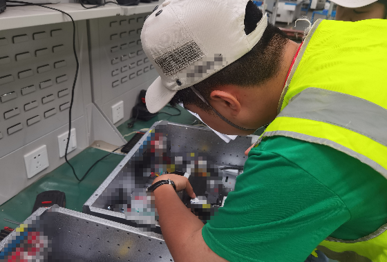 7月8日上午,中车机电科技有限公司的装配车间中,电气学院株洲实践队员曹志波、周嘉葆、宋哲武、李宣颉、邓佳雯、廖灿璨紧随一线师傅李海燕在自动化车间进行输配电检验工作。