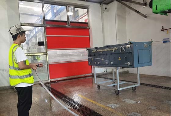 “给门板粘贴密封条是防水工作中最重要的一环”,彭师傅为实践队员讲解了产品的防水原理和检验流程。了解了理论与流程后,实践队员们经转运设备,将试件送入淋雨实验房试验。如何调节水压?如何控制水管方向?在师傅的指导下,实践队员们亲手握住了手柄,拿起了高压水枪。落实到环节,把好质量关,做到零失误。有了质量保障,产品才能在特殊的环境下正常工作。