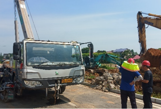 到达施工现场后,望着高高的吊车吊臂,曹增辉迅速找到施工处负责人,表明来意,在询问对方施工单位及该段道路施工简要情况后,用《电力行业安全生产法律法规》中的几项条例,向其强调了在电网线路附近施工的注意事项。考虑到施工中可能存在的安全隐患,曹增辉记录了施工处负责人的联系方式,并再次提醒对方吊车要规范作业。交涉完毕后,实践队员注意到吊车与杆塔线路之间还有一定距离,未对线路造成威胁,似乎并无安全问题。面对实践队员的疑问,曹增辉解释道:“我们在电网工作一定要居安思危,防患于未然,何况吊车在埋管工作进行中马上要逼近线路了,处境已经不算安全啦。”