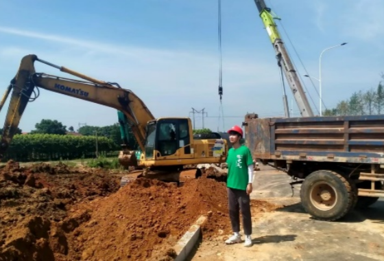 7月14日上午,电气学院赴国网益阳实践队运检一班队员彭雄飞在曹增辉师傅的带领下赶往益复II线九号杆塔附近与道路埋管施工处负责人交涉,防止过高的吊车误触杆塔线路。