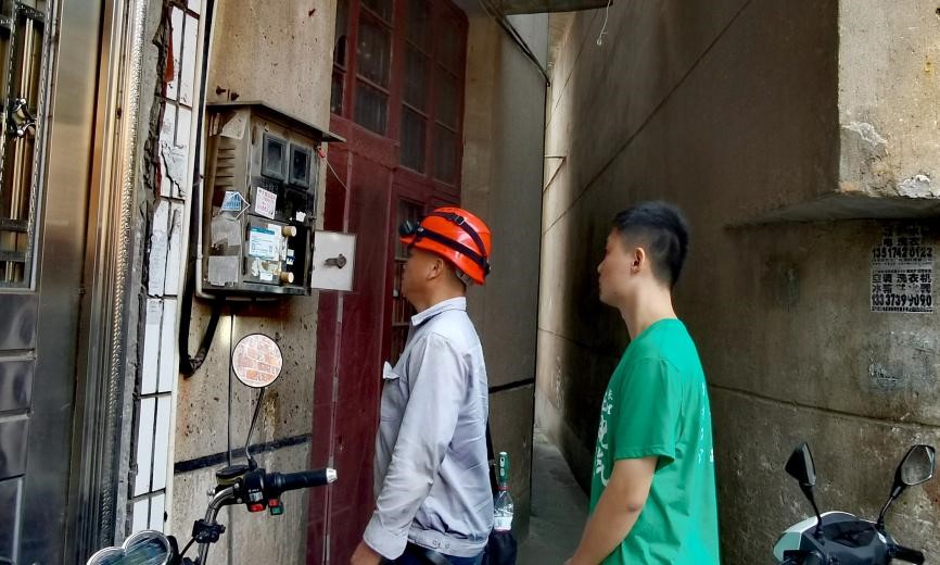 前往报修点途中,欧师傅向实践队员讲解抢修工作流程及作业观摩注意事项,并反复强调“抢修工作安全第一”。抵达故障现场后,欧师傅开展用电故障检修工作,通过检查用户电表、观测表内接线及开关情况、询问用户用电状况等迅速判断故障原因,并进行维修恢复供电。“这是由于超负荷用电引起的电表停转,属于内线故障,建议办理电表增容,将单相表换成三相表。”恢复供电后,欧师傅向用户解释故障原因并给出后续维修方案。