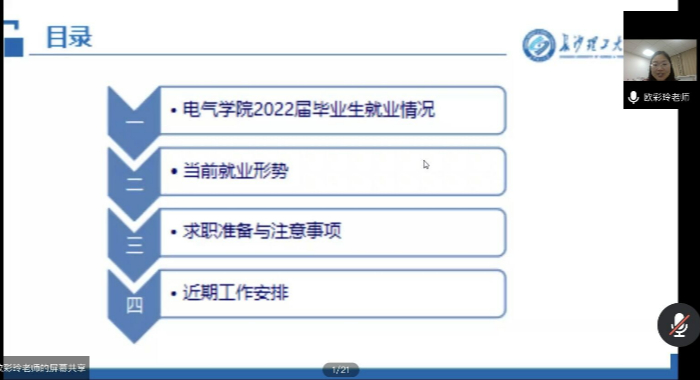 首先,欧彩玲就电气学院2022届毕业生就业情况和当前就业形势做了非常详实的讲述。她指出当前的就业形势严峻,内卷严重,同学们要有紧迫感,要尽快转变就业观念,结合自身实际情况,对自己有一个全面的认识,先就业再择业。随后她就如何做好求职准备以及求职过程中的注意事项为毕业生们进行了详细的介绍,包括简历的修改完善、就业信息的获取、云就业平台的使用、网签三方协议需注意的事项等。针对毕业生提出的问题,欧彩玲耐心为同学们答疑解惑。最后,她就近期工作安排做了统一部署,并表示学院领导老师会为全体毕业生求职就业保驾护航!