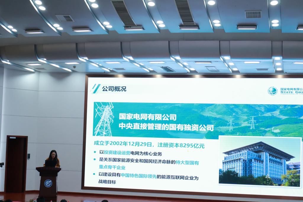 参加招聘宣讲会的同学们首先观看了国家电网校园招聘宣传片。宣传片全面、立体、直观介绍展示了国家电网有限公司企业概括、人才战略和企业文化。随后国家电网有限公司宣讲员王小帅进行了校园招聘宣讲,介绍了各直属单位的人才招聘相关情况。