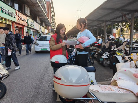 志愿者们化身“流动科普站”,带着宣传册走进校区周边的社区与街道,温柔交流间传递环保温度。遇到提着菜篮的阿姨,他们指着宣传册上的图标细细拆解“厨余垃圾怎么分类”;碰到带孩子的家长,又蹲下身用卡通插画轻声教小朋友认“哪些是可回收物”。一位接过宣传册的居民笑着说:“这些大学生娃娃讲得真明白,我们不光听得懂,往后也知道怎么做了!”