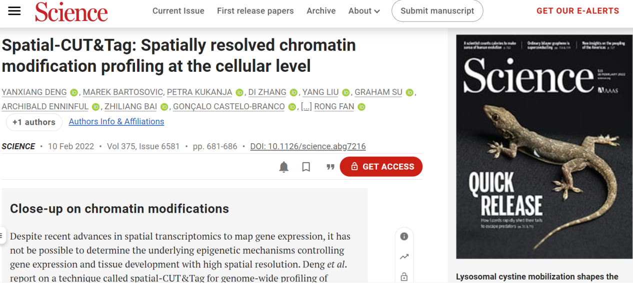 近日,2010届校友邓彦翔博士以第一作者在《Science》上发表了一篇研究论文,题为“Spatial-CUT&Tag: Spatially resolved chromatin modification profiling at the cellular level”。他们开发了一种空间分辨的表观遗传分析新技术,首次实现了在空间和全基因组水平上观察组织发育的表观遗传机制,以及对发育和疾病相关的表观遗传调控的空间映射,有望开辟全新治疗途径。该研究由耶鲁大学生物医学工程系教授、耶鲁大学医学院病理学教授樊荣领导,与瑞典斯德哥尔摩卡罗林斯卡学院的研究人员合作完成的。