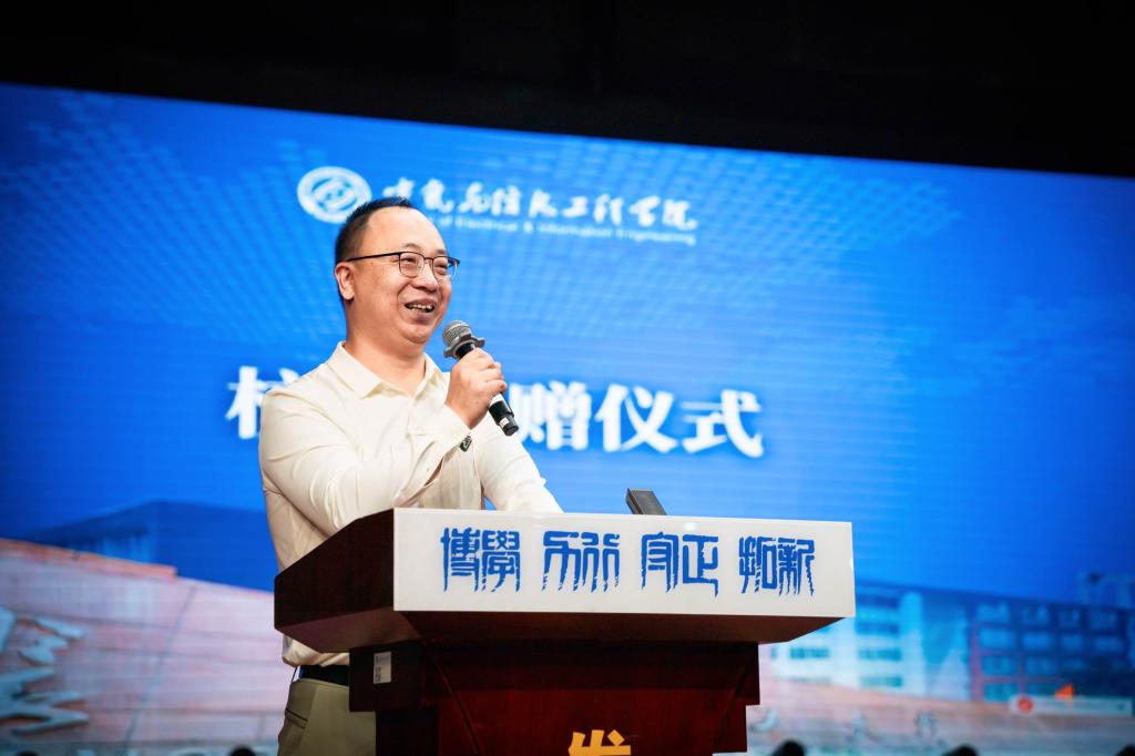 张军辉代表学校向郑智勇先生表示感谢。他表示,“校友的成就,是母校最骄傲的名片;校友的回归,是对教育最深情的反哺。”他鼓励全体新生以优秀校友为榜样,珍惜韶华、锤炼本领,成长为具有家国情怀与创新精神的高素质工程人才。